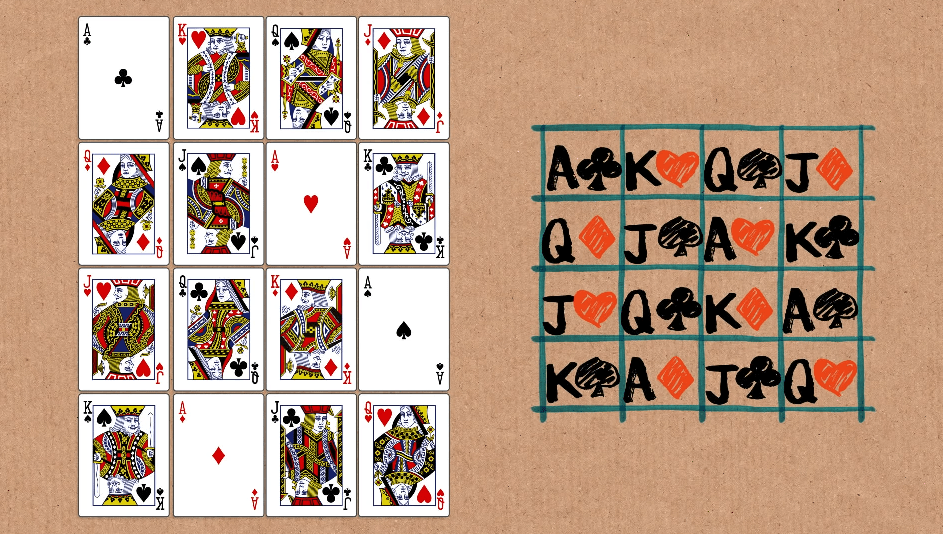 Take Ace, King, Queen, Jack of all colours from a deck of playing cards. The aim is to arrange them in a square 4×4 grid such that: